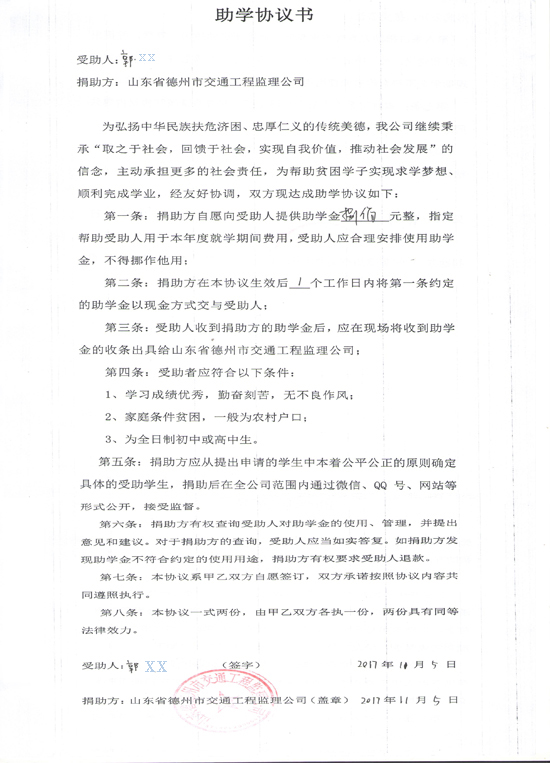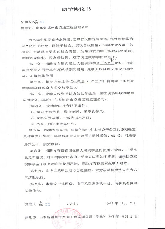 在此基礎上,我們認為公司還能做得更好更多,優秀企業對社會的信譽不應該停留在提供關注本身的層面上,而應該通過承擔更多的社會責任、幫助需要的社會群體實現公司更大價值,也為員工自我價值的提升提供一個平臺。樂善好施、扶貧幫困是中華民族的傳統美德;相互幫助、患難扶持是社會倡導的時代新風。它既體現了人類最高尚的品質、最美好的情感和道德情操,又是社會文明與進步的標志。帶著對這一份理解,監理公司決定在全公司范圍內發起倡議,用我們的愛心,竭盡全力圓新生力量的“讀書夢”。我們將為條件家庭困難的莘莘學子提供讀書條件,幫助他們順利完成學業。